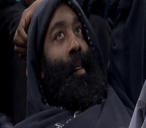 快船后场核心哈登因为右肩酸疼缺席,他来到现场躺着观看比赛。