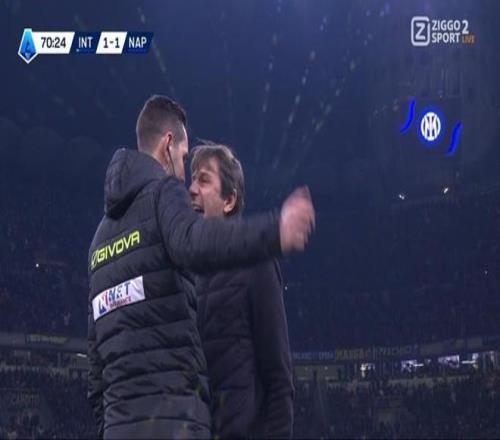 这个判罚让孔蒂勃然大怒。甚至在主裁回看录像之前,那不勒斯主帅就抓起皮球狠狠地朝看台扔去。他激烈抗议裁判判给国米点球的决定,而他的抗议最终导致他被直接红牌罚下。