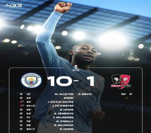 全场战罢,比分定格在惊人的10-1,曼城连轰10球狂胜埃克塞特城,成功晋级足总杯第4轮!